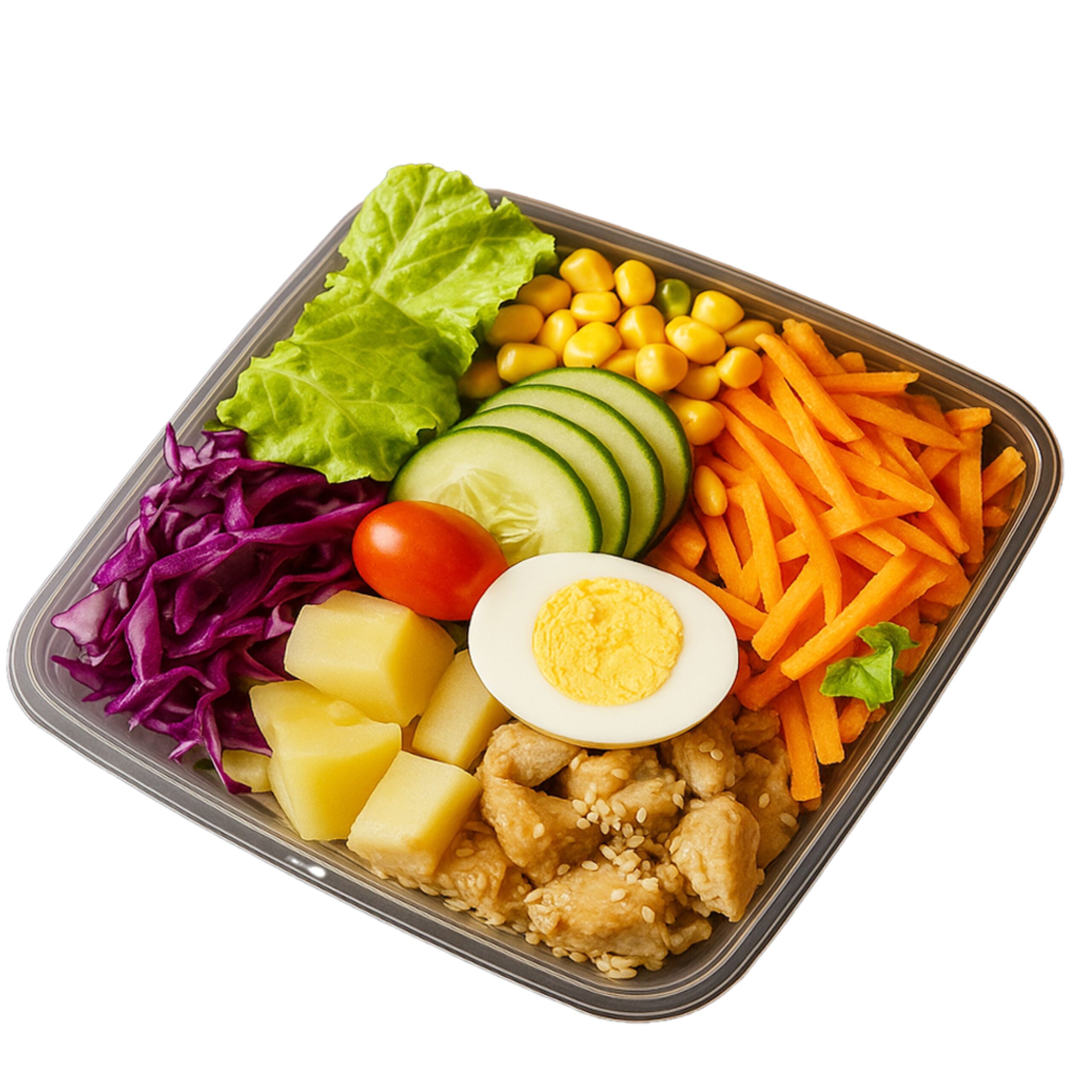 Isi: Selada, Timun, Telur Rebus, Ayam Grill, Kentang Rebus, Wortel, Tomat Ceri, Kubis Ungu, Jagung Manis